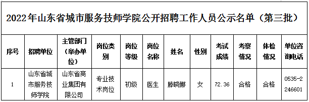 根據(jù)《中共山東省委組織部、山東省人力資源和社會保障廳關(guān)于印發(fā)2022年度省屬事業(yè)單位公開招聘工作實施方案的通知》(魯人社發(fā)〔2021〕18號)等相關(guān)規(guī)定,山東省城市服務技師學院經(jīng)過公開招聘報名、考試、考察、體檢等工作,現(xiàn)對擬聘用人員(第三批)進行公示,公示期為7個工作日,自2022年12月9日至2022年12月19日(不含節(jié)假日)。公示期間,如對公示人選有異議,請及時向山東省商業(yè)集團有限公司反映。