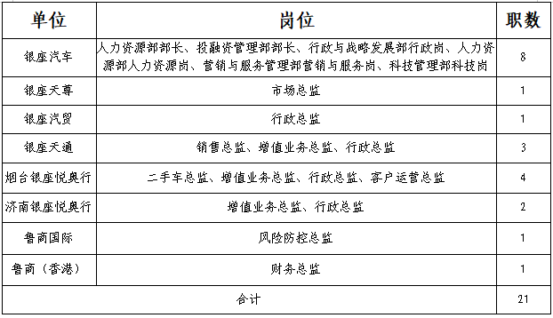 公司總部各部室崗位8人、直屬單位管理層崗位13人。崗位職責和任職資格詳見附件1。條件特別優秀者可適當放寬要求。