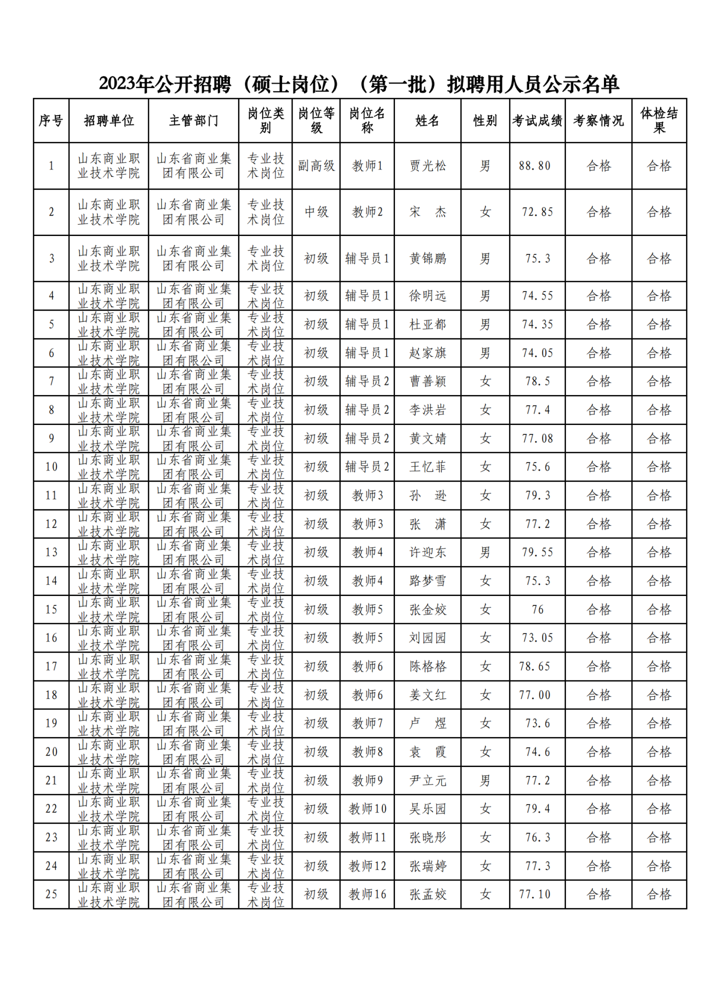 根據《中共山東省委組織部山東省人力資源和社會保障廳關于印發2023年度省屬事業單位公開招聘工作實施方案的通知》(魯人社發〔2022〕23號)和省屬事業單位公開招聘有關政策規定,按照崗位招聘計劃,山東省商業集團有限公司所屬山東商業職業技術學院組織完成了2023年公開招聘(碩士崗位)(第一批)工作人員招聘考試、體檢、考察等工作,現對該單位擬聘用人員進行公示。公示期為7個工作日,自2023年10月18日至2023年10月26日(不含節假日)。公示期間,如對公示人員有異議,請向山東省商業集團有限公司組織人力資源部反映。反映問題要實事求是,并告知真實姓名及聯系方式。