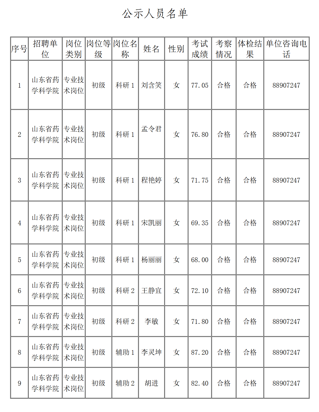 〔2023〕14號(hào))等相關(guān)規(guī)定,山東省藥學(xué)科學(xué)院組織完成了公開(kāi)招聘考試、考察、體檢等工作,現(xiàn)對(duì)擬聘用人員進(jìn)行公示,公示期為7個(gè)工作日,自2024年7月10日至2024年7月18日(不含節(jié)假日)。公示期間,如對(duì)公示人選有異議,請(qǐng)及時(shí)向山東省商業(yè)集團(tuán)有限公司反映。